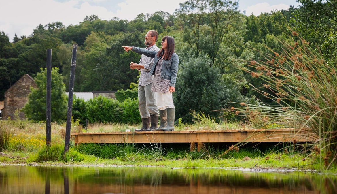 Sophie et Régis sont deux artistes passionnés qui se sentent proches de la nature. Alors, quand on leur a proposé de créer une oeuvre liée à la biodiversité des zones humides en plein coeur de la Bretagne, leur premier réflexe a été d’arpenter l’Observatoire de la biodiversité pour se familiariser avec la faune et la flore locales. Et c’est sur la dolomède qu’ils ont jeté leur dévolu ! Sophie et Régis l’ont observée, dessinée… De la conception jusqu’à l’installation au coeur de la mare, ce fut une formidable aventure. Leur sculpture monumentale de métal et bois de bruyère invite à ressentir la beauté et la fragilité de la nature. L’effet est inattendu, l’araignée se dresse en majesté dans la lumière, immense, nous interrogeant sur notre rapport au vivant… Pour une fois l’animal est si grand et nous si petits. Vous pouvez venir la contempler été comme hiver, au crépuscule comme à la tombée du jour. Sensations garanties…