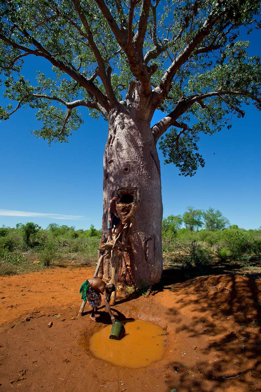 These spectacular giants have a number of uses. Their fruits are edible, and their pulp is mixed with water and sugar to make a refreshing, nourishing drink. On the Mahafaly plateau (a particularly arid area), live baobab trunks are hollowed out and turned into reservoirs to stock water during the rainy season. These precious supplies see men and women through the dry season. “The baobab is the only tree that can be hollowed out and filled with water without it dying or rotting,” says Pascal Maitre.