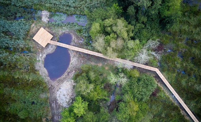 Les prairies humides et les araignées, deux entités souvent mal-aimées parce que mal connues, sont ici mises à l’honneur par les artistes Sophie et Régis qui voient dans la plus infime parcelle du vivant, une raison de s’émerveiller. Invités par la Fondation Yves Rocher à considérer une prairie humide à la Gacilly, ils ont été impressionnés par l’existence d’une araignée pêcheuse : la Dolomède des marais. Cette araignée incroyable a inspiré toute la création d’une œuvre géante qui trône, une patte dans la mare, au milieu de l’espace.